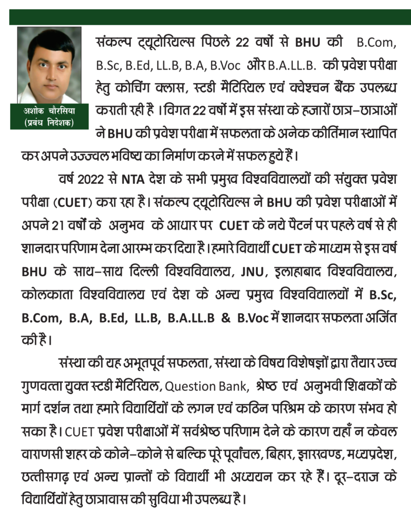 BHU – B.Com. प्रवेश परीक्षा की तैयारी के लिए संकल्प ट्यूटोरियल्स पूर्वांचल की सर्वश्रेष्ठ कोचिंग संस्था है। यह संस्था BHU – B.Com. के साथ साथ BHU की B.Sc, B.Com, B.A, LL.B. और B.A.LL.B की प्रवेश परीक्षा हेतु कोचिंग क्लास, स्टडी मटेरियल एवं Question bank उपलब्ध कराती है। पिछले 20 वर्षो में इस संस्था के कई हज़ार छात्र छात्राओं ने BHU प्रवेश परीक्षाओं में सफलता प्राप्त कर अनेक कीर्तिमान स्थापित कर अपने उज्ज्वल भविष्य के निर्माण की ओर अग्रसर हुए।